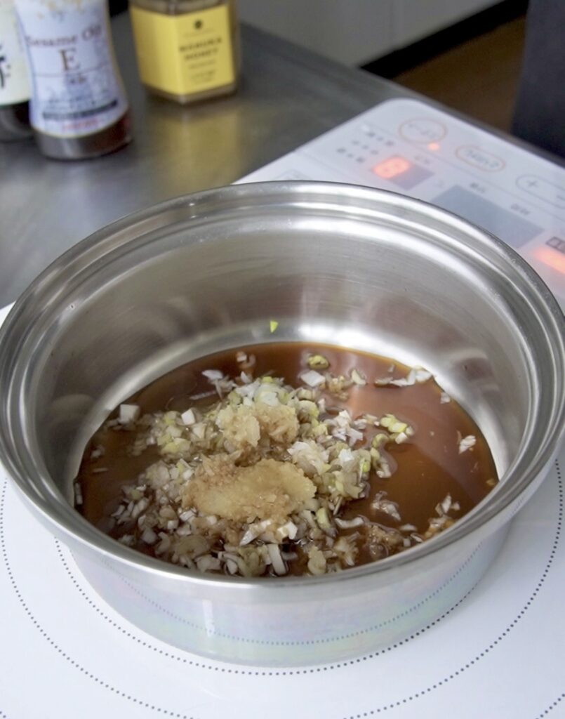 ③小ソースパンにネギぽん酢たれの調味料を入れて、ひと煮立ちしたら加熱をやめてネギを入れ和える