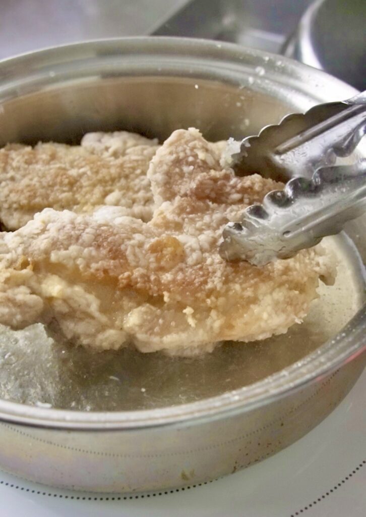 ④中フライパンに油を入れフライ 180度にセット。肉を皮面から入れ5分程度揚げ、ひっくり返して更に2,3分揚げる