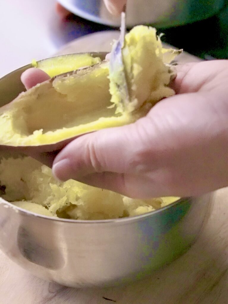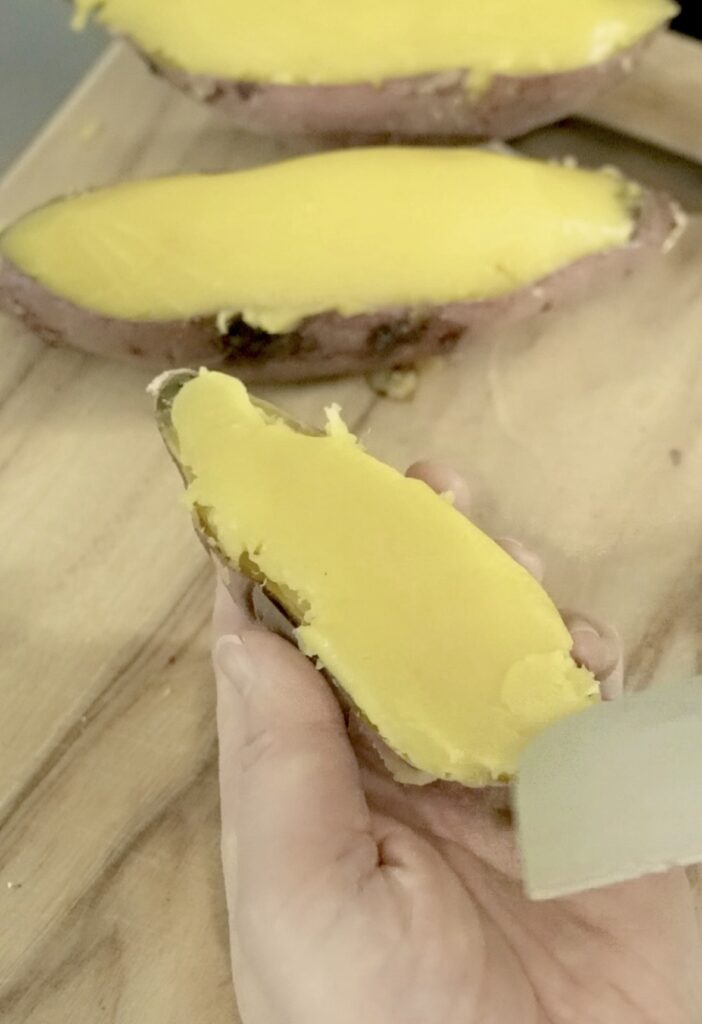 ⑤皮を容器にしてさつまいもペーストを詰める