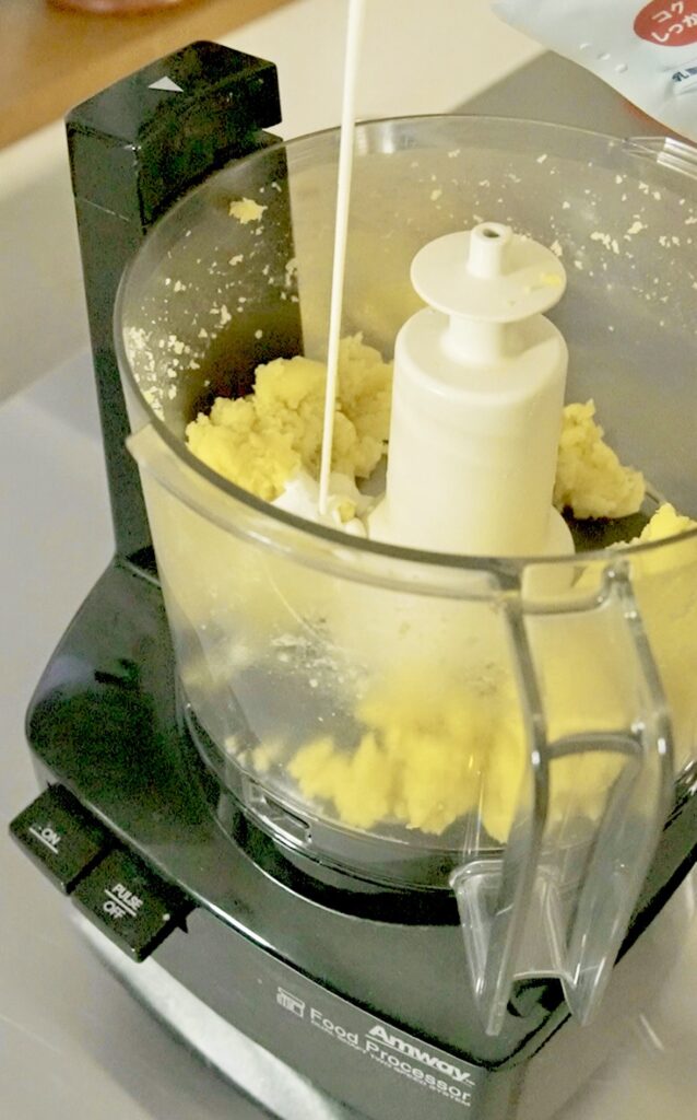 ③くり抜いた部分をフープロに入れ、バター・生クリームを加えてなめらかになるまで回す