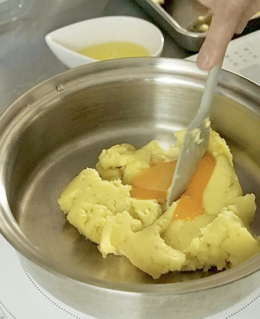 ④中フライパンに③を入れ、卵黄を加えて中火IR5で加熱しながら練る