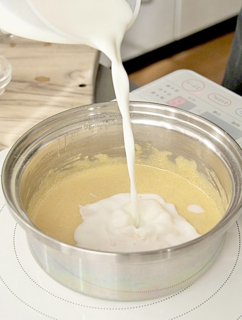 ①小ソースパンに卵黄、砂糖、薄力粉をしっかり混ぜてから、牛乳を3回に分けて加え溶かす