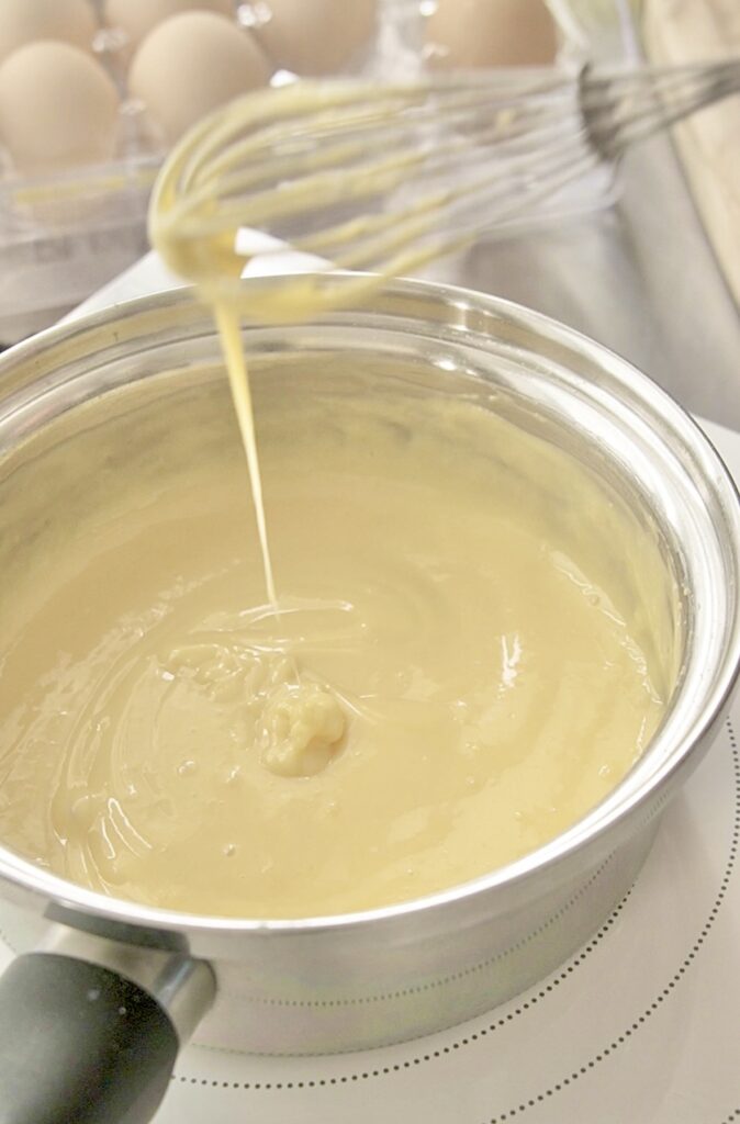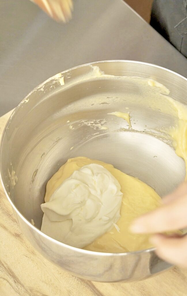 ⑨冷めたカスタードをなめらかにし、ウィスクで泡立てた生クリーム(砂糖入り)と混ぜ合わせる