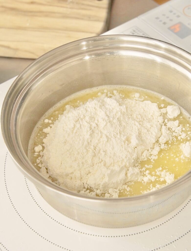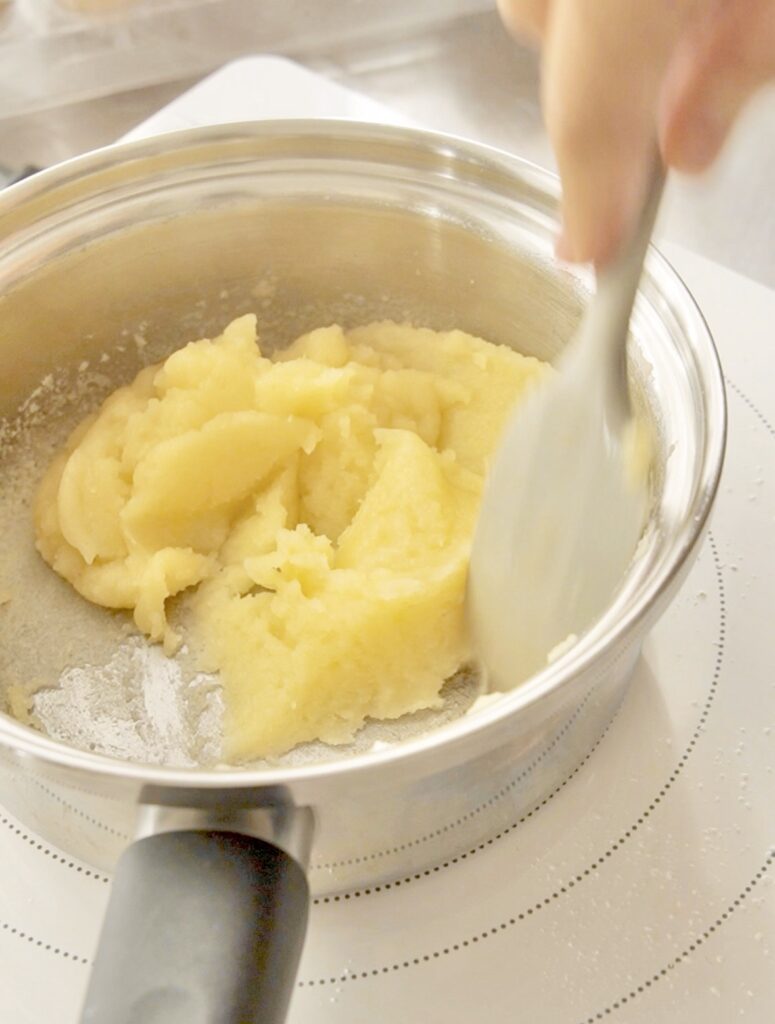 ③小ソースパンに浄水とバターを入れ、中火(IR6)で沸騰させてバターが溶けたら加熱を止める。ふるった薄力粉を一度に入れ、素早く混ぜる
