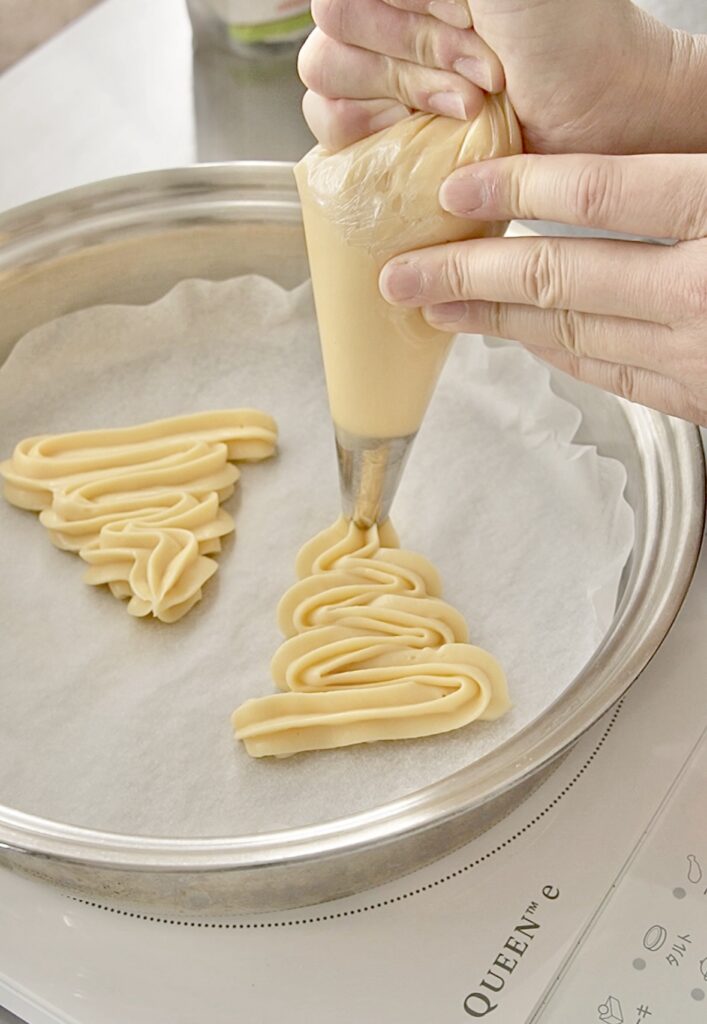 ⑥大フライパンにクッキングシートを敷き中火(IR6)で予熱しておいたところに、生地をツリーの形に2つ絞り出す