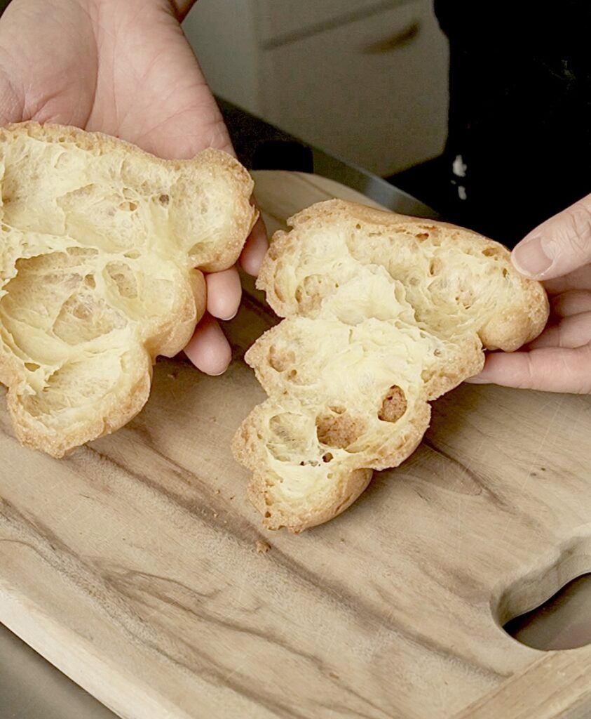 ⑦蓋をして中火(IR5)で40分間焼く。バスタオルでフライパンを覆う(途中で蓋を開けない)焼き上がったシューは半分にカットする