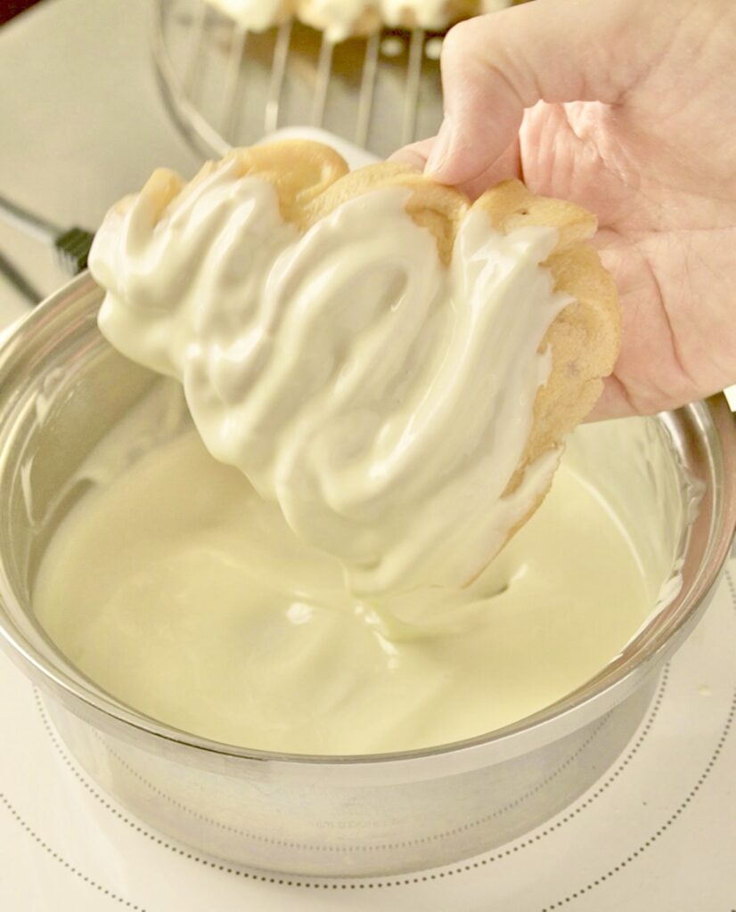 ⑧小ソースパンにホワイトチョコを割り入れて保温45度で溶かし、上になるシューにコーティングし、冷蔵庫で冷ます