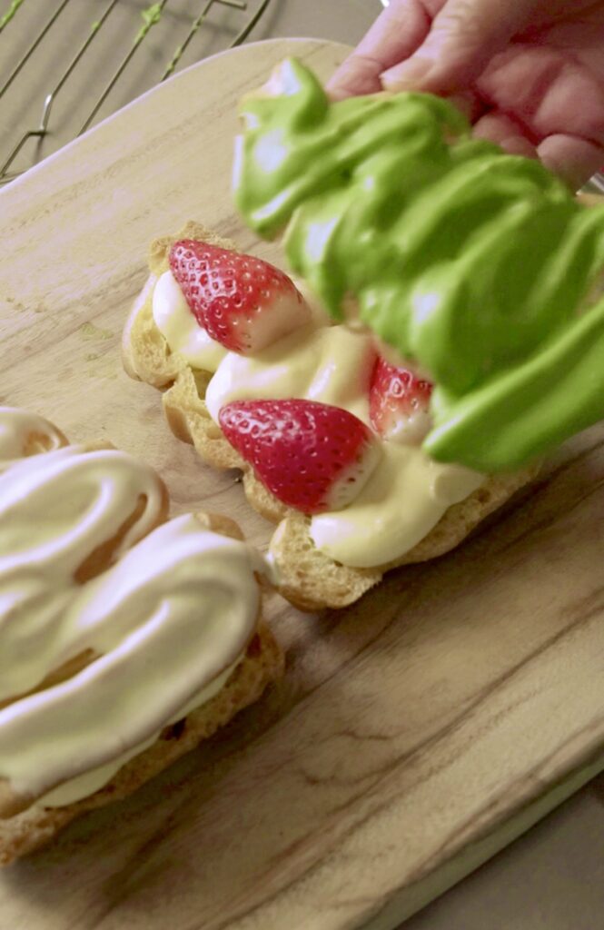 ⑩クリームを絞り出し苺をのせ、上部分のシューをのせて完成