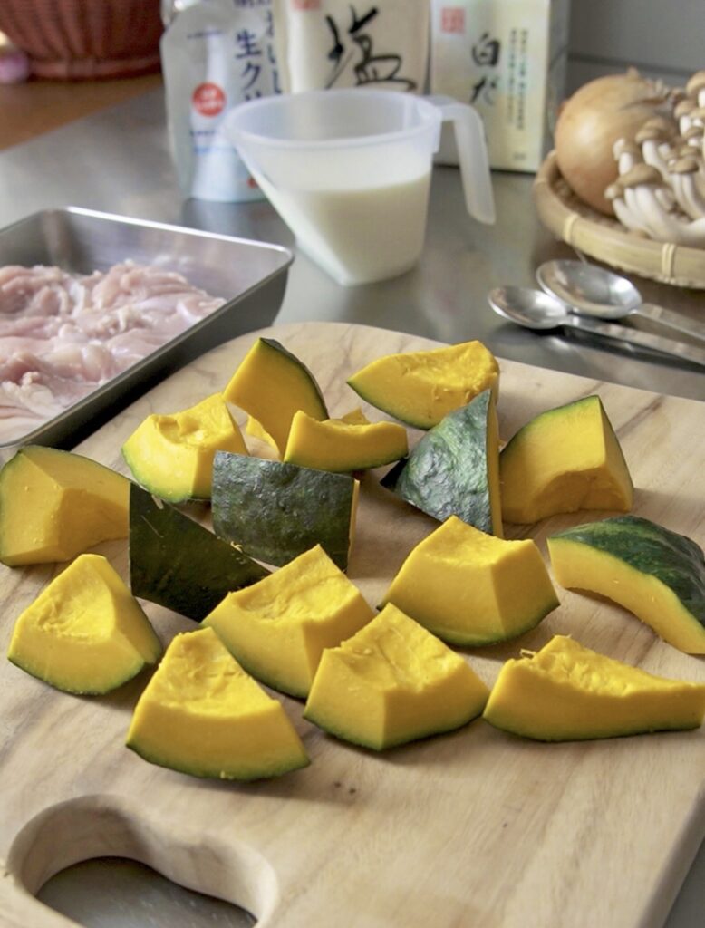 ①かぼちゃ・鶏ももは一口大、玉ねぎはスライス、しめじはほぐす