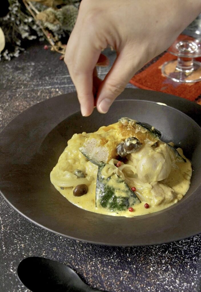 ④味見して、好みで塩胡椒と白だしで整える。器に盛り、好みでピンクペッパーを振る