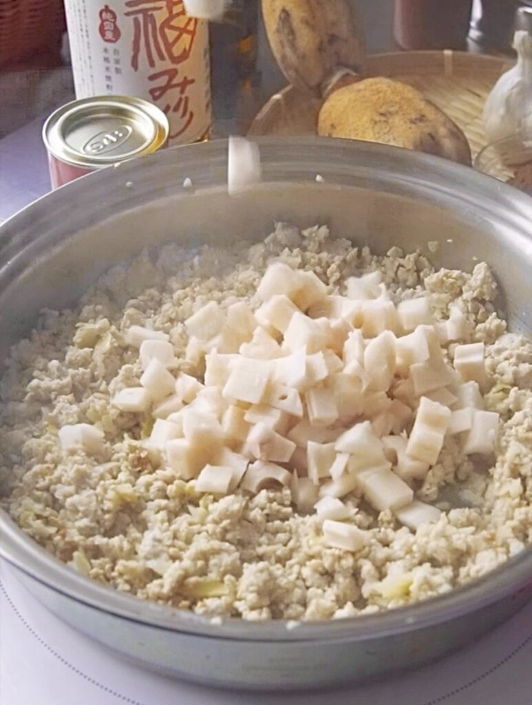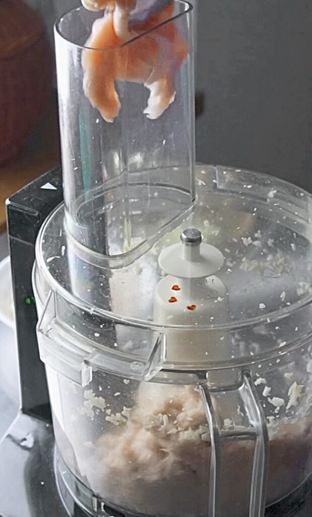 ①フープロで生姜とにんにくを先にみじん切りにしてから、次に豚肉を加えて回しミンチにする
