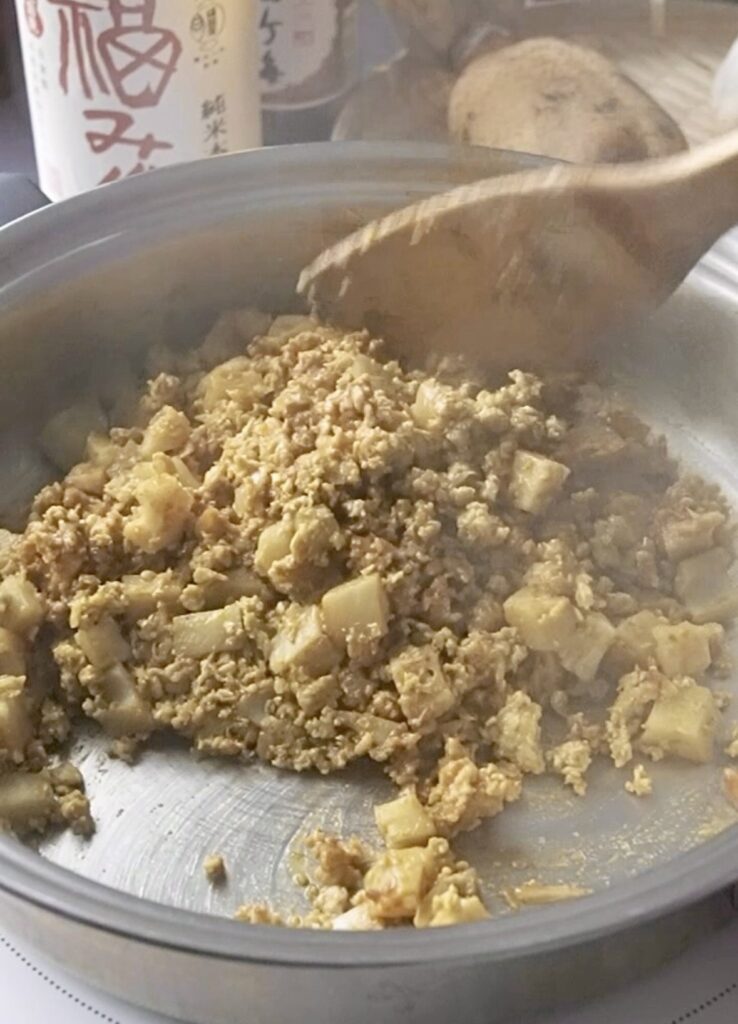 ⑤れんこんが好みの固さになったら、カレー粉を全体混ぜてから、合わせておいた調味料を加える