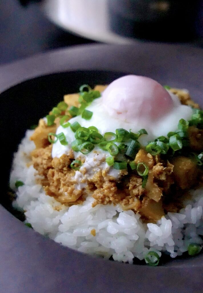 ⑥3分ほど中火で炒めたら完成。器のごはんの上に盛り、好みで温泉卵と薬味ネギを添える。