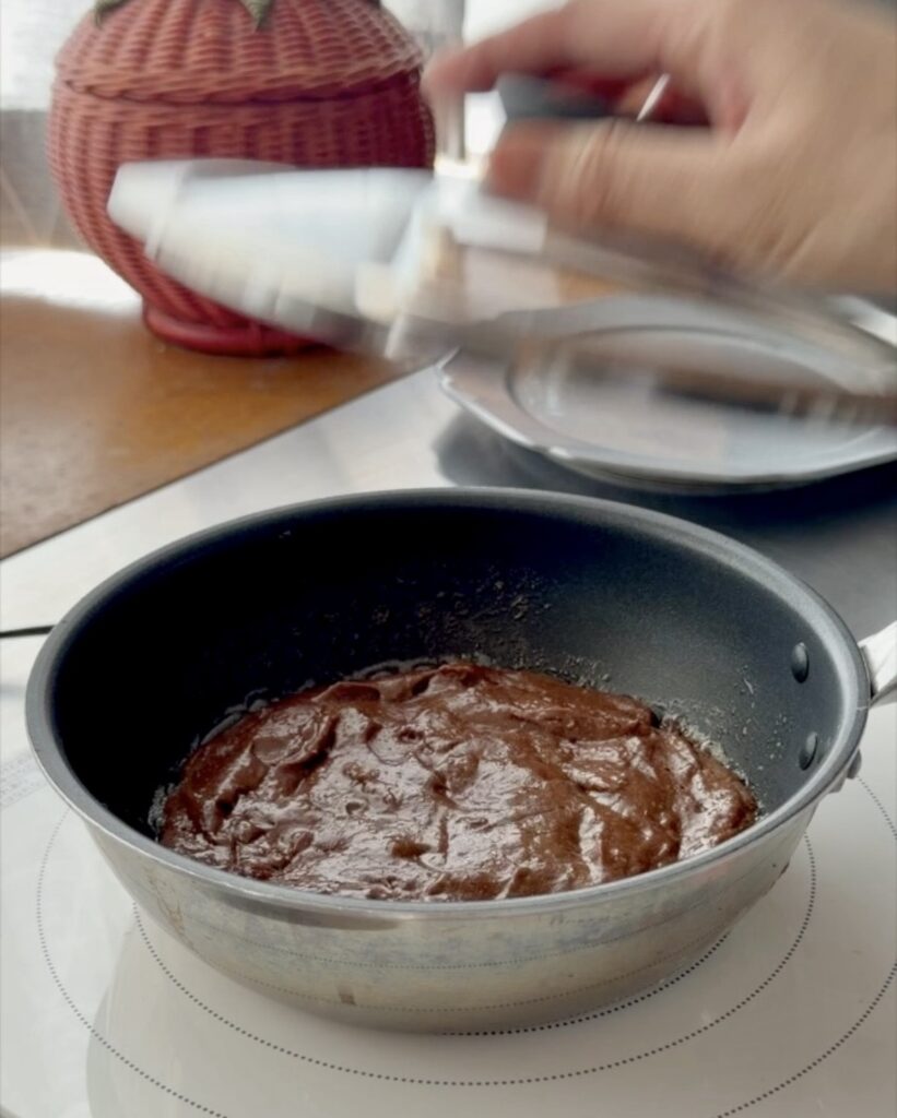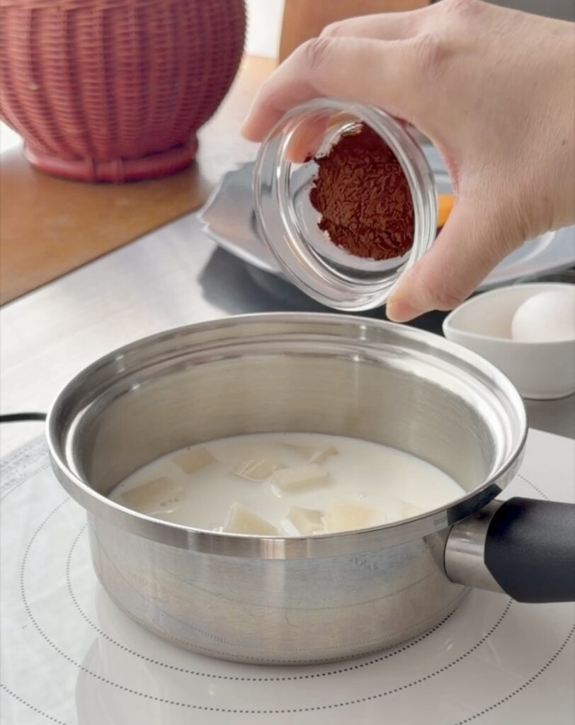 ① 1cmに切った餅・牛乳・砂糖・ココアを入れ
