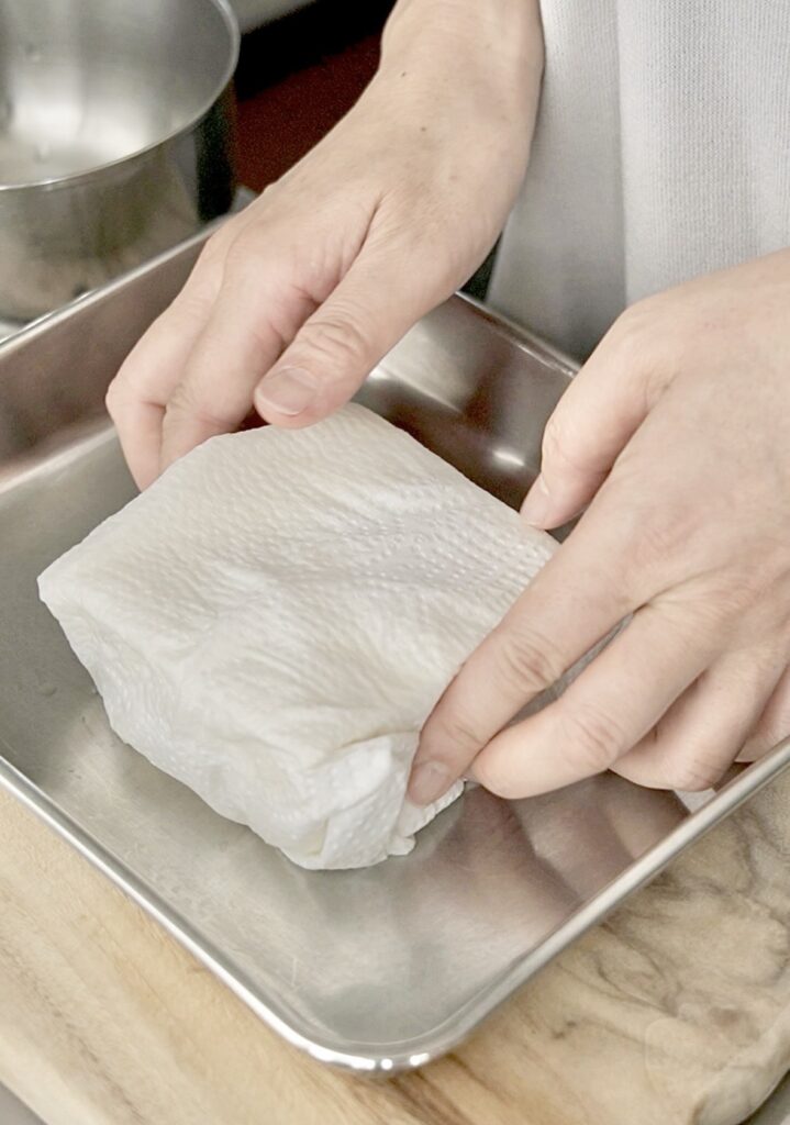 ①豆腐はキッチンペーパーで包み、10分置いて水切り。