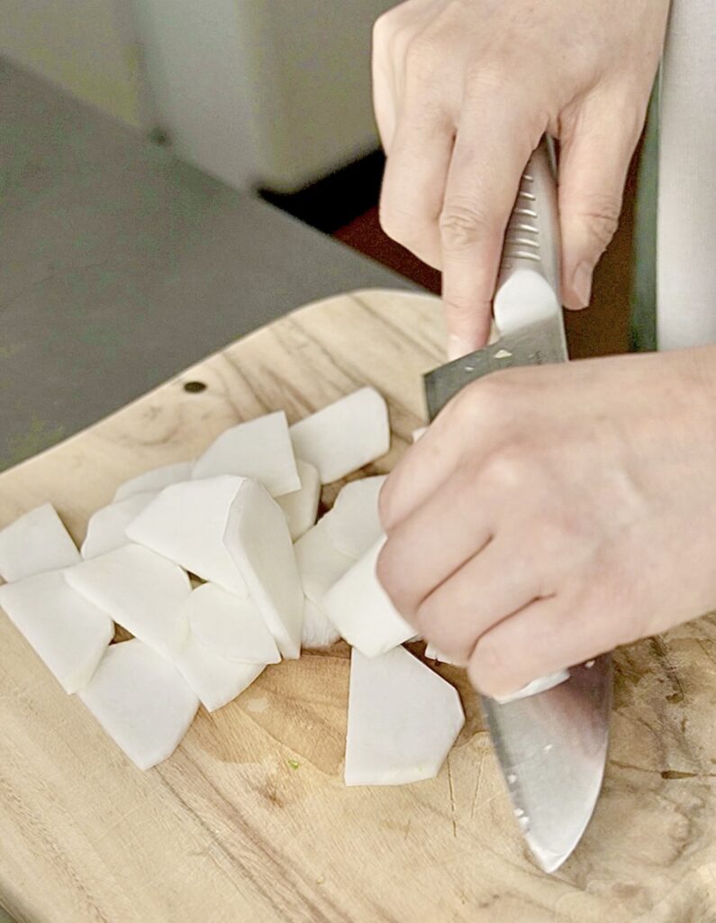②かぶと柿は皮をむき5mm程度の半月切り。