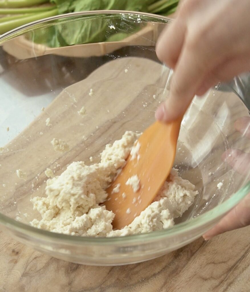 ③ボウルに豆腐を入れ、滑らかになるまで潰す。