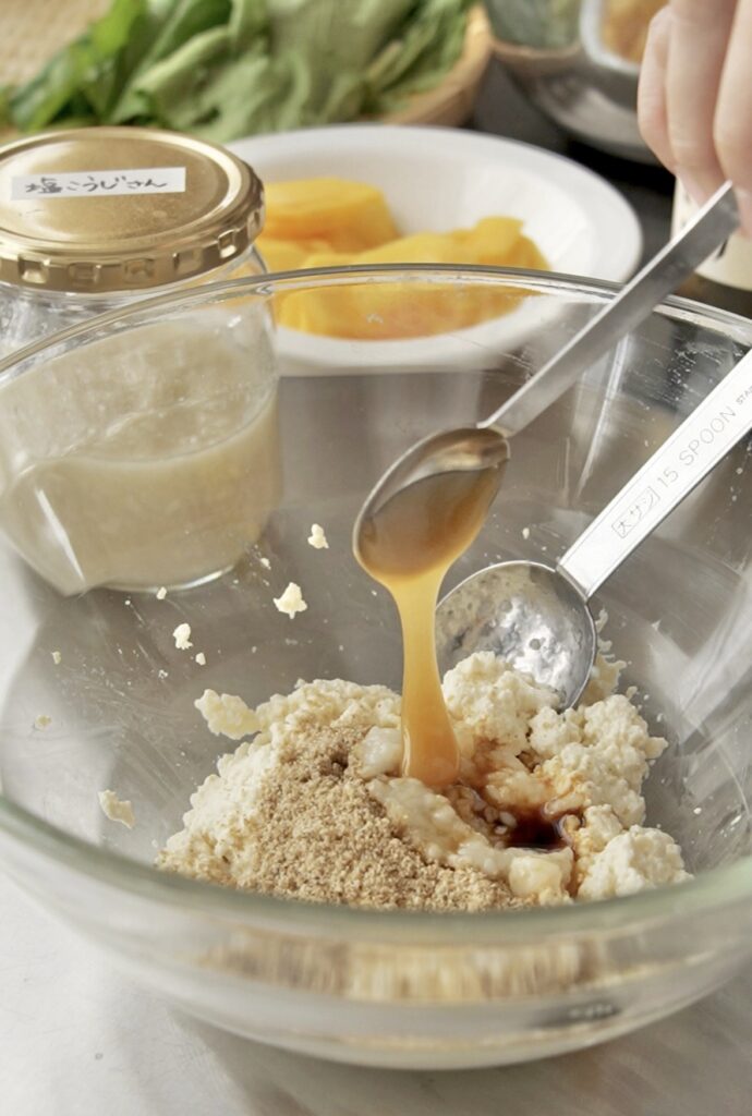 ④塩こうじ・すりごま・はちみつ・しょうゆを混ぜて白和えの衣を作る。