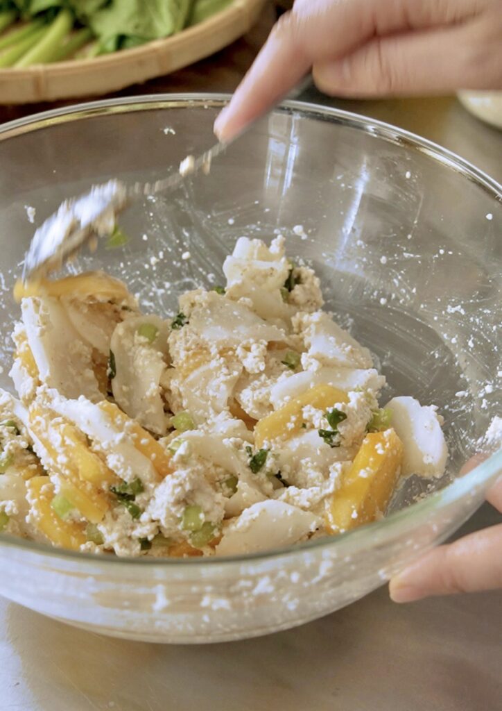 ⑤かぶ・柿を加えて全体をやさしく和える。